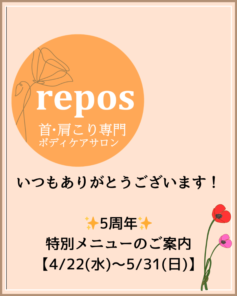 三重県鈴鹿市でリラクゼーション、ボディケアマッサージ、ドライヘッドスパのできる古民家プライベートサロンなら“首・肩こり専門ボディケアサロン repos”にお任せください。