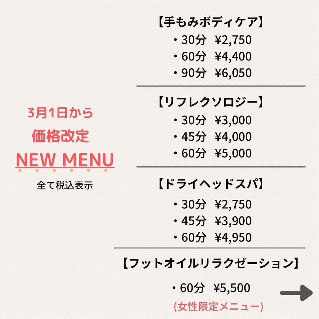 【価格改定・施術メニュー変更】についてお知らせさせていただきます。